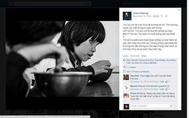 Nhiếp ảnh gia Việt Nam James Duong: anh dành rất nhiều thời gian cho các bộ ảnh, những câu chuyện anh kể là về những con người đặc biệt, hoặc người bình thường nhưng đặc biệt nhờ những góc chụp và câu chữ của anh. Là một người mình rất ngưỡng mộ và nguồn cảm hứng cho mình theo đuổi thể loại phóng sự kể chuyện đến nay.